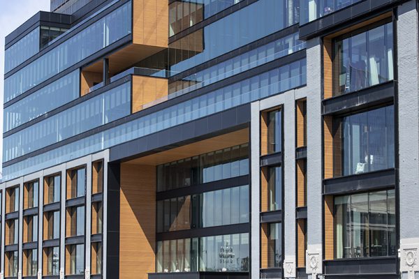Wausau Window and Wall Systems engineered and factory-glazed more than 112,000 square feet of HR and HRX INvision™ unitized window wall, finished in the wood grain and anodize coatings by Linetec.