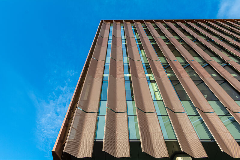 The Copper Anodized shading system was custom-fabricated and installed by M.G. McGrath. The aluminum shade fins feature a curved profile with perforations. Each fin composes a vertical blade attached directly into the glass and aluminum curtain wall.