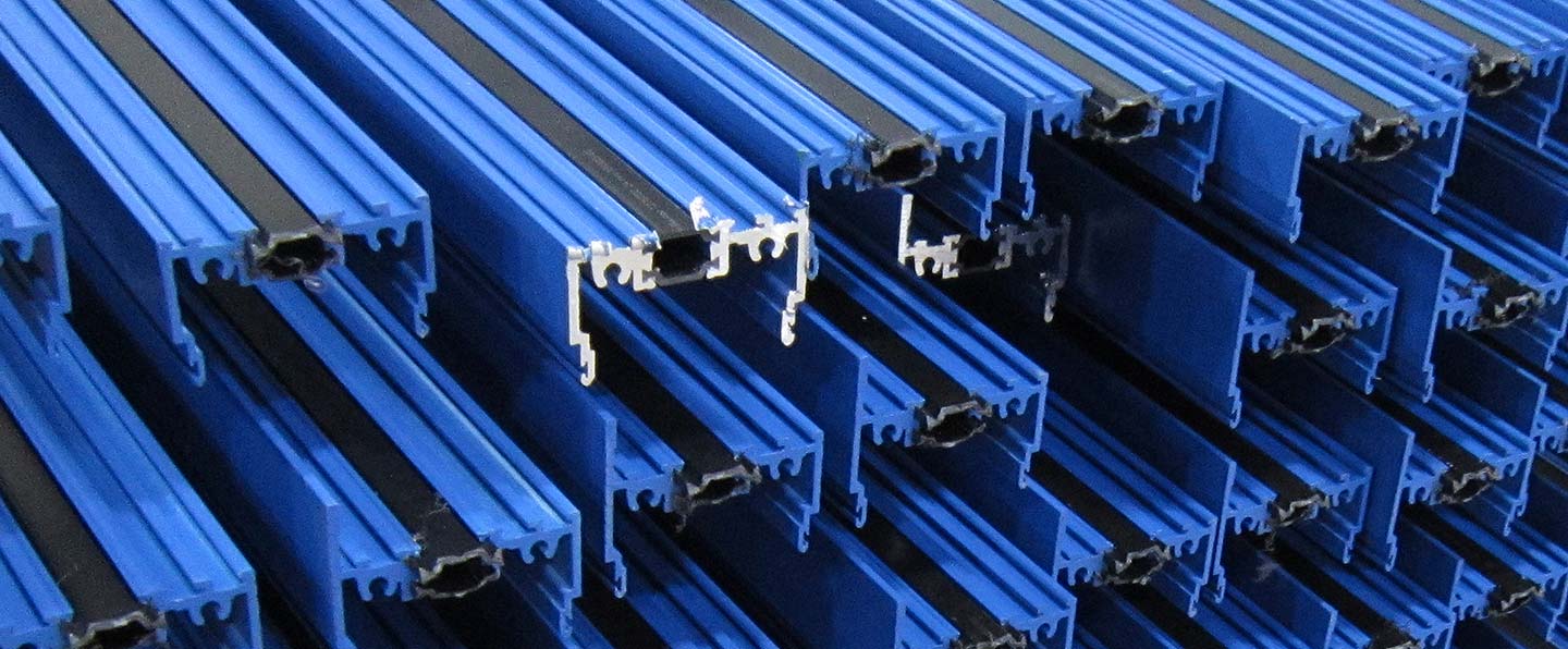 The assembled aluminum and Strut profiles then act as a composite to transfer loads. Over 1300 pounds of pressure is applied in stages to crimp the aluminum. The first set of wheels applies 50 percent of the pressure while the second set applies 100 percent. The third set of wheels help to straighten the extrusion and completes the crimping process.